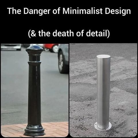 Nesse post que mencionei, o autor compara a arquitetura cheia de detalhes e cores de outras décadas com os seus correspondentes atuais – peças prateadas ou envidraçadas que se esforçam para se camuflar em meio ao concreto, ou entre paredes brancas e peladas.