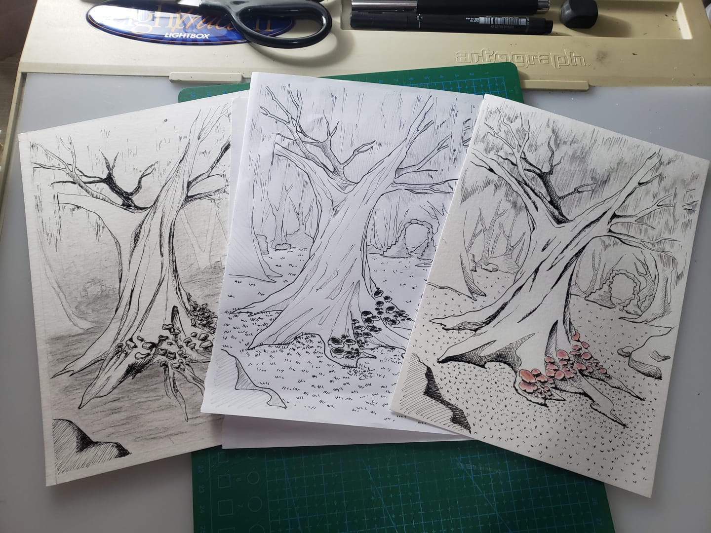 Acontece que, se eu olhar para alguns dos meus melhores trabalhos, todos tiveram várias versões até chegar na “agora_sim_é_essa_valendo”. E em alguns casos eu tinha adorado a primeira versão, mas a última ficou melhor. E o motivo é meio óbvio, mas não custa relembrar: quanto mais a gente repete uma coisa, mais a gente se familiariza com ela. No caso do desenho ou da pintura, isso significa que, ao refazer, a gente vai se acostumando às linhas, às formas gerais, e consegue se concentrar em detalhes que à primeira vista passaram batidos. A cada versão, a gente tem uma desculpa pra experimentar algo um pouco diferente, e assim vai testando os limites do que nos é confortável até sair da caixinha, ou pelo menos abrir uma janelinha esquisita nela.