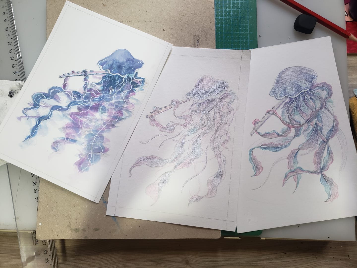 Esses dias o Gabriel falou uma coisa que foi quase um tapa na cara, mas eu provavelmente mereci. Estava sofrendo para aceitar que teria que refazer uma pintura que tinha dado mais certo na minha cabeça do que no papel. Só que ela já tinha me dado um tanto de trabalho, eu já tinha perdido um certo tempo, e o fato de ainda não estar boa soava como um enorme fracasso; um sinal de que eu estava totalmente enganada e de que nada ia dar certo naquele projeto inteiro. Então, ele falou: “Ué, você sempre reescreve seus textos quinhentas vezes e não acha ruim. Por que com a ilustração seria diferente?”